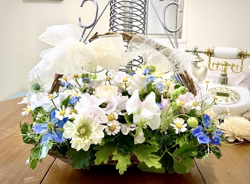 ※こちらのお写真は過去にオーダーメイドでご注文いただいたフラワーアレンジメントになります。