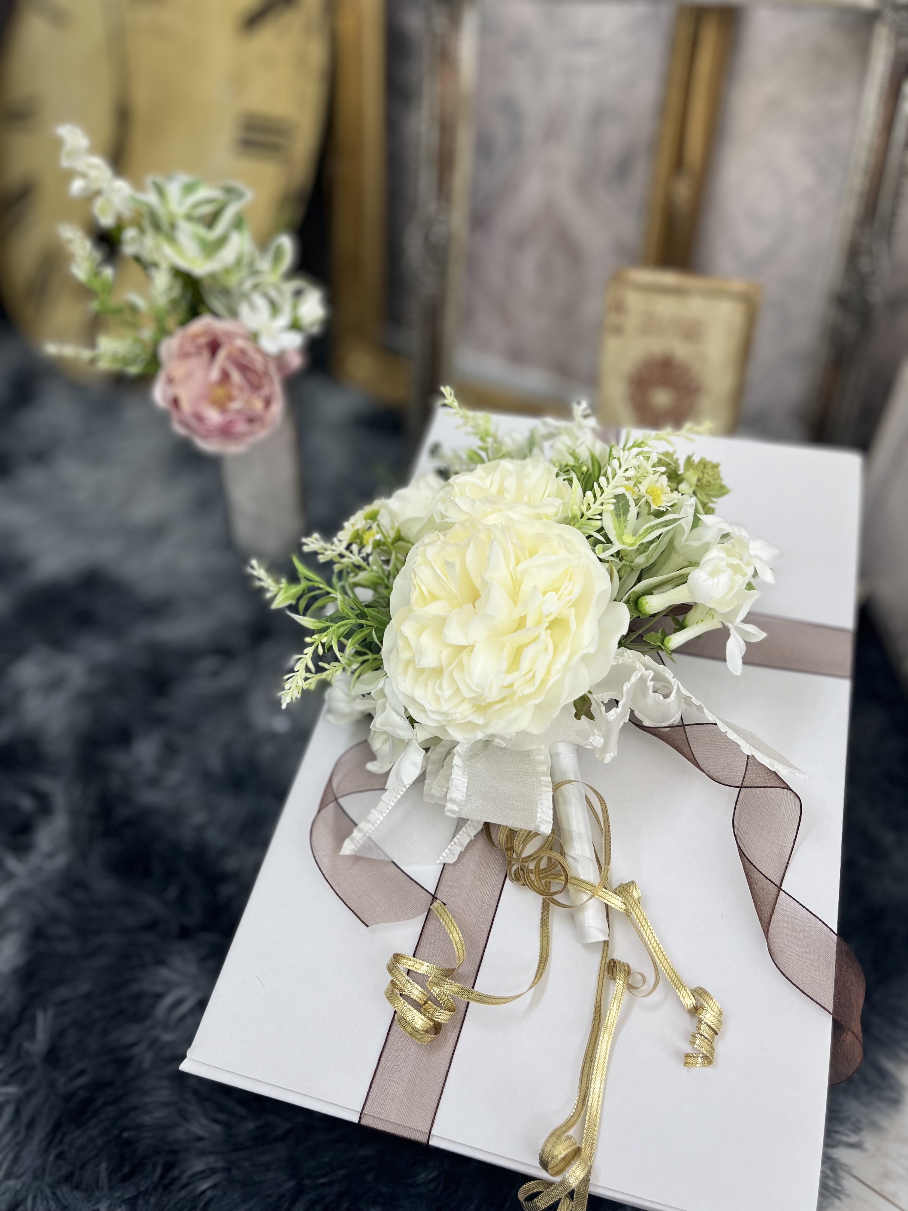 アーティフィシャルフラワーアレンジメントのブーケを用いたラグジュアリーな贈答用のラッピングをご用意しております。